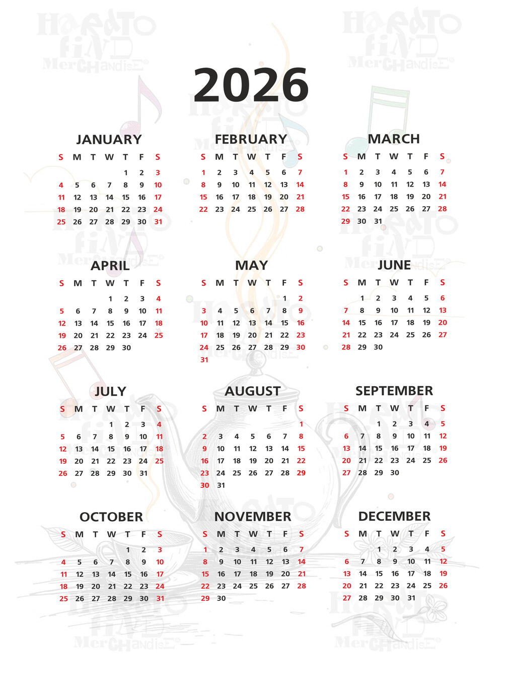 2026 One-Page Kitchen Wall Calendar — Original Creative Artwork by HTFM Instant Download