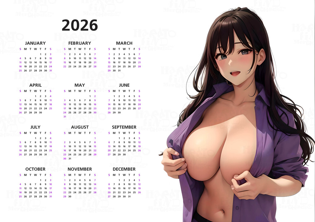 2026 Calendar Printable A3 Wall Art Cute, Busty Manga, Minimalist, Big Boob Instant Download,