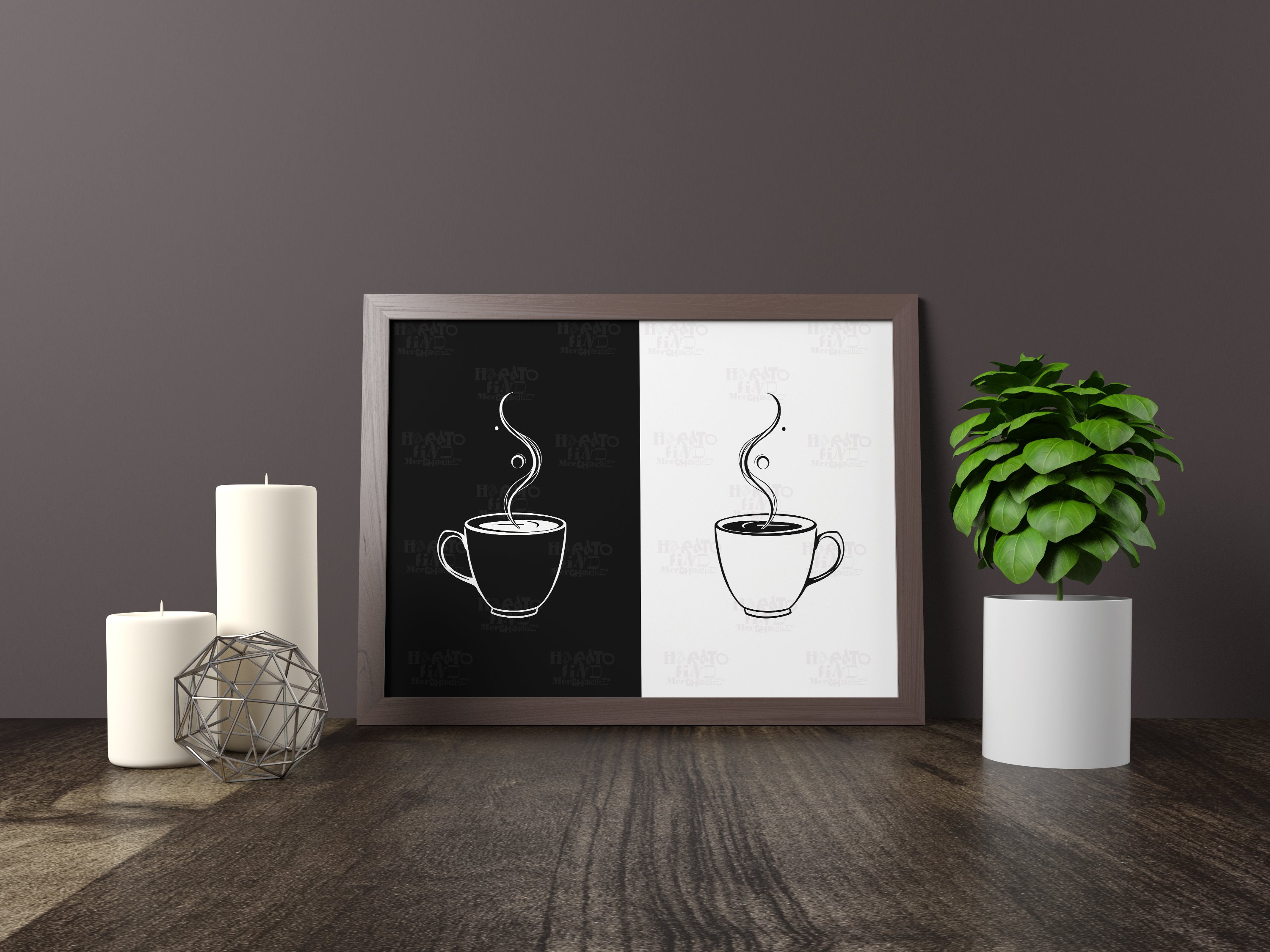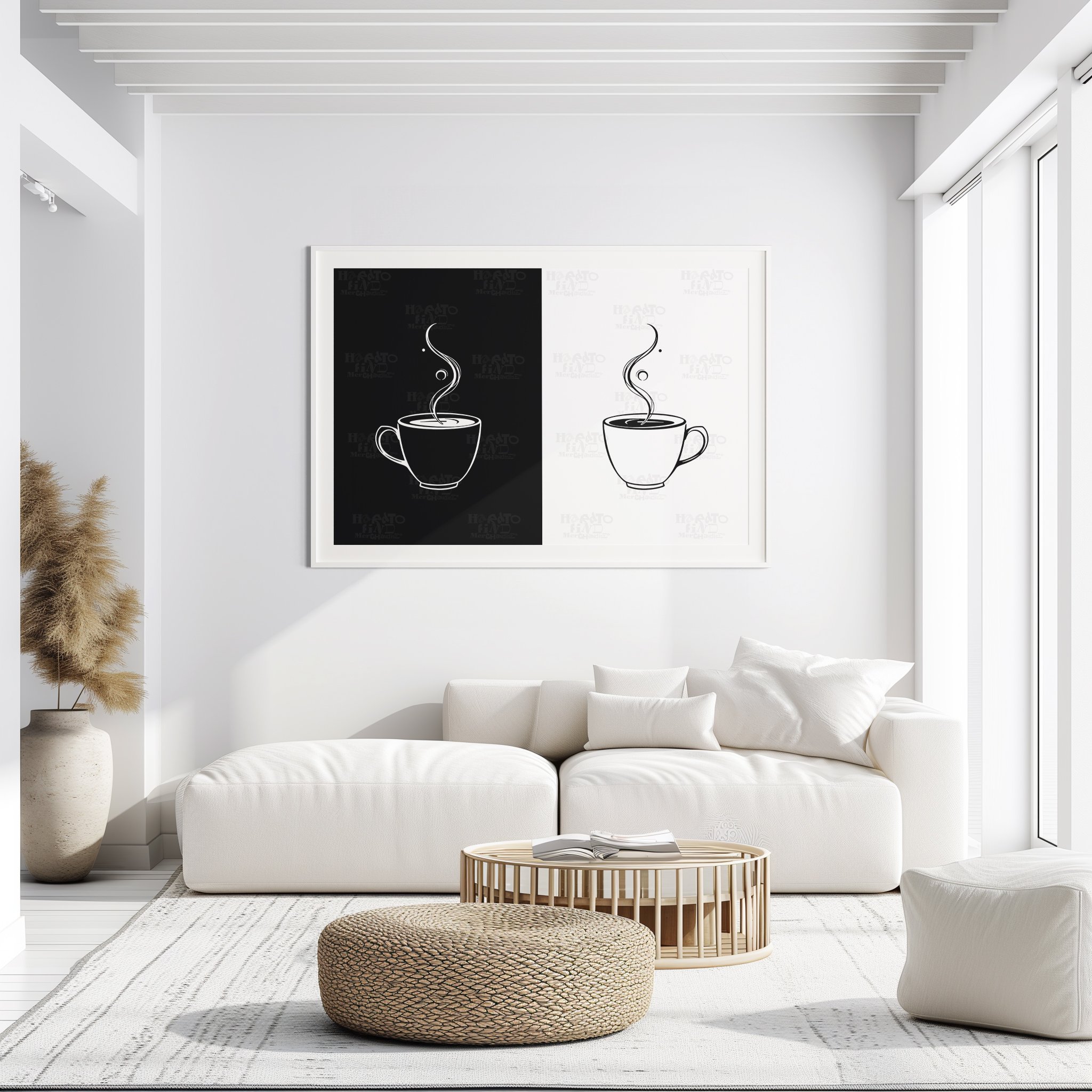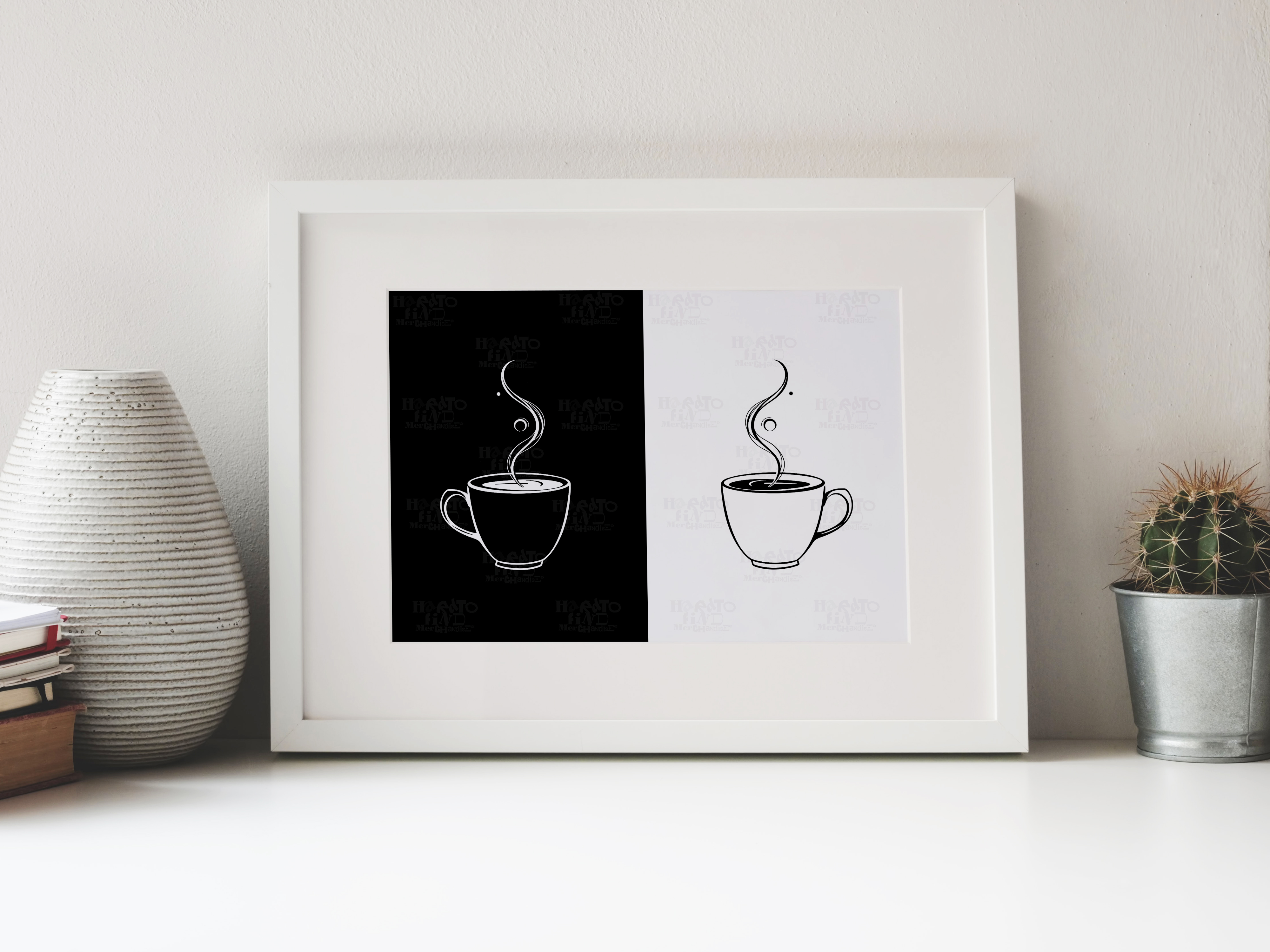 A minimalist coffee cup illustration expressed through fluid linework and gentle steam, presented in black and white inverted forms. A calm visual meditation on routine, warmth, and stillness.