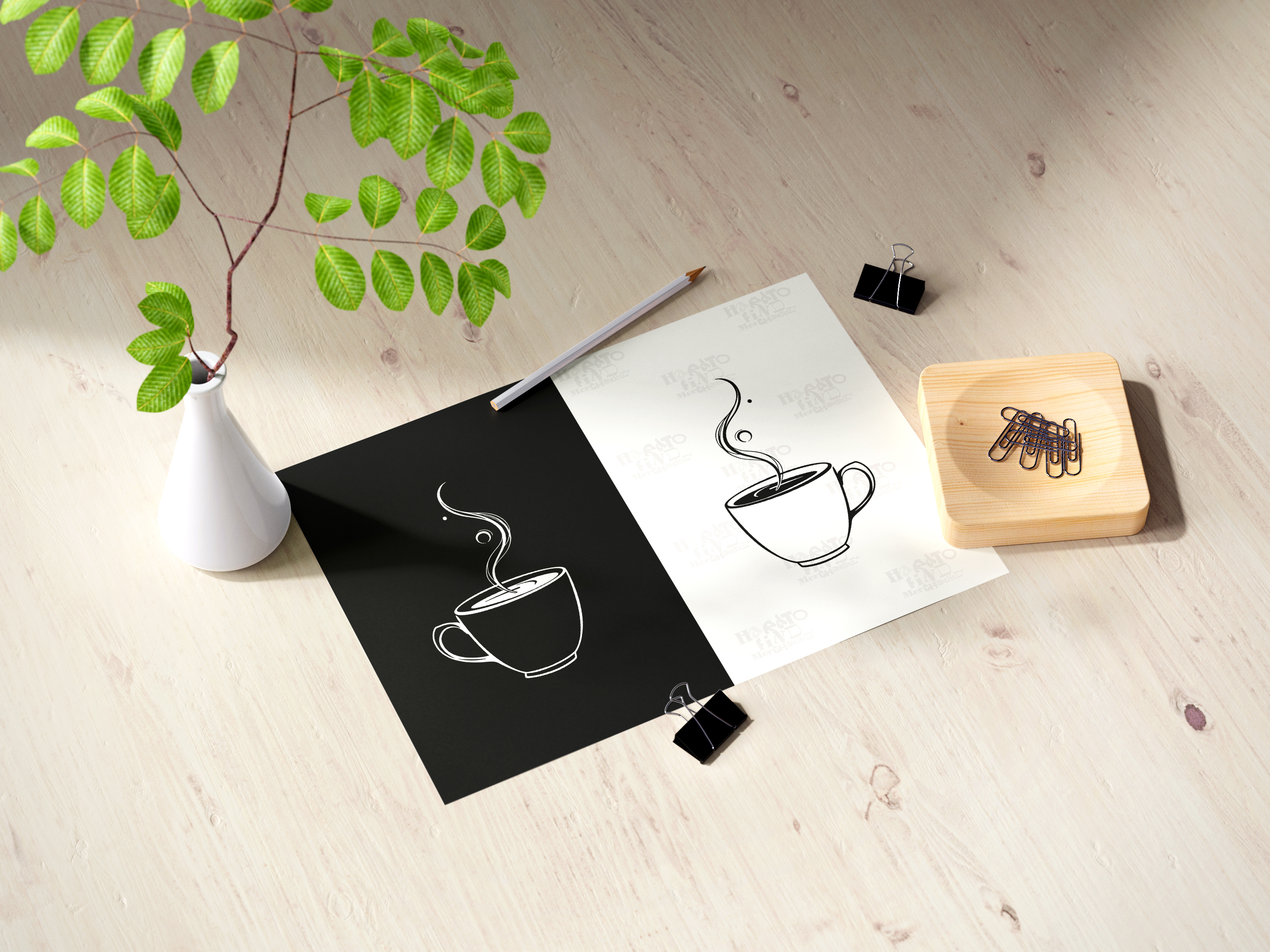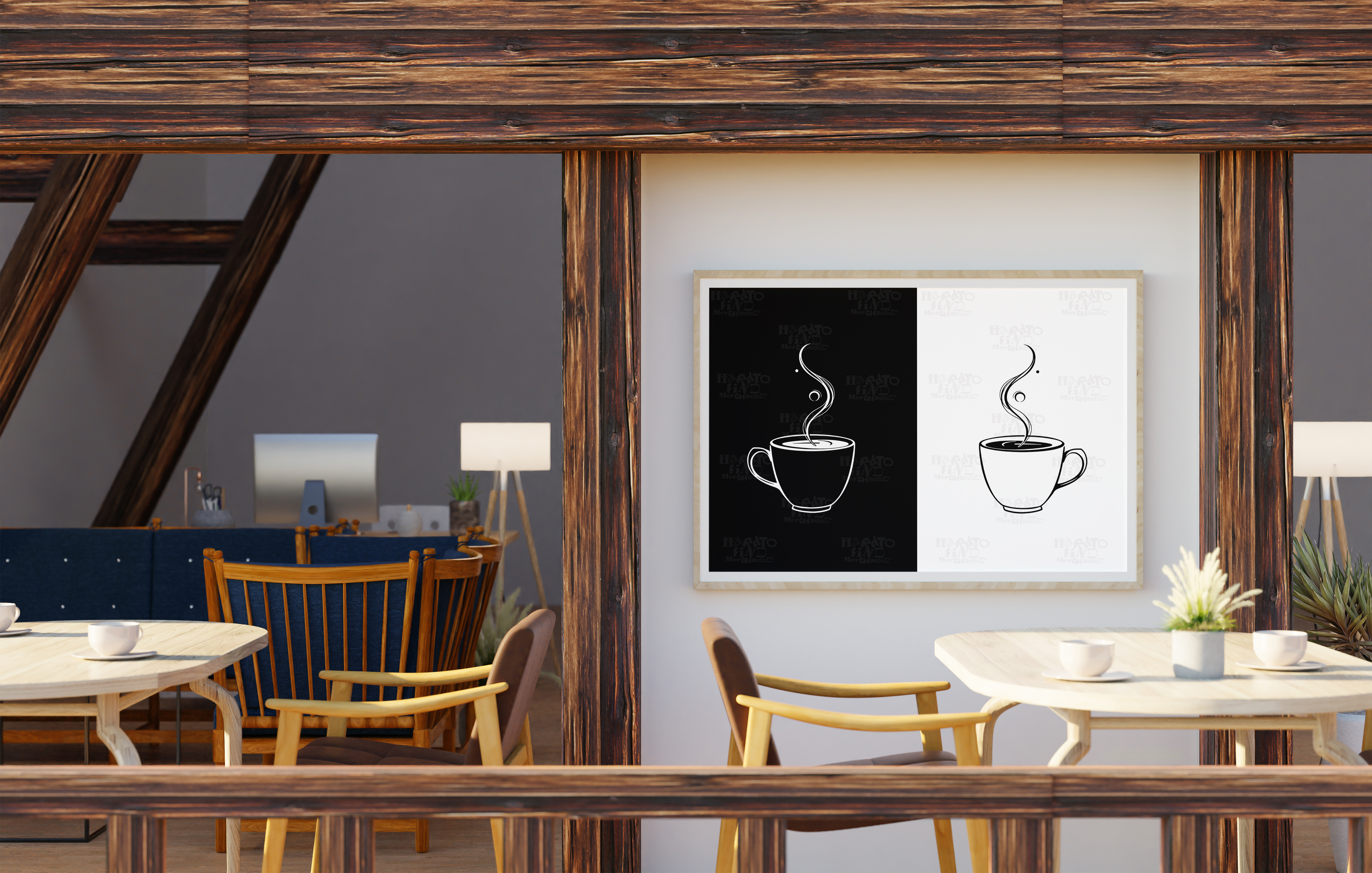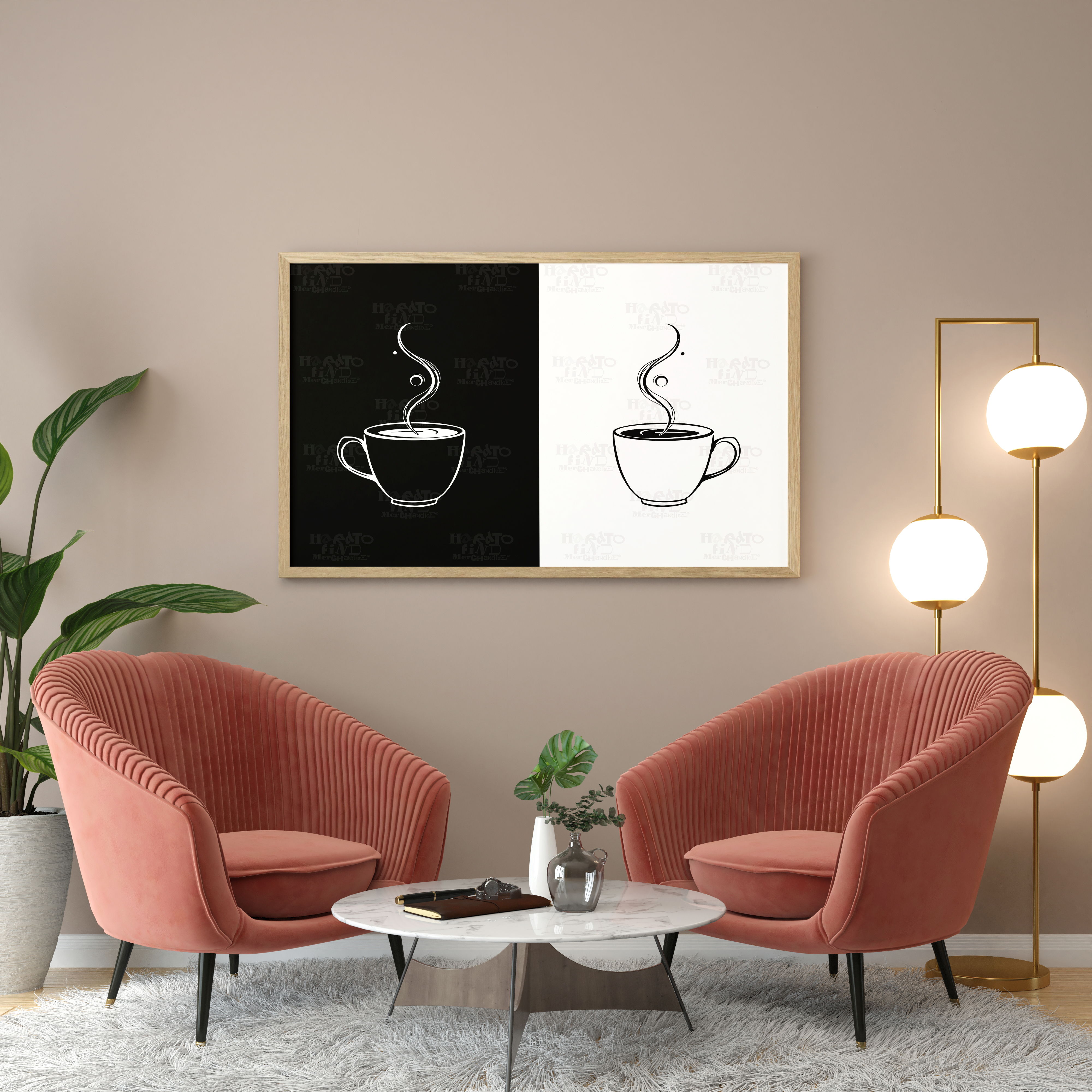 A minimalist coffee cup illustration expressed through fluid linework and gentle steam, presented in black and white inverted forms. A calm visual meditation on routine, warmth, and stillness.