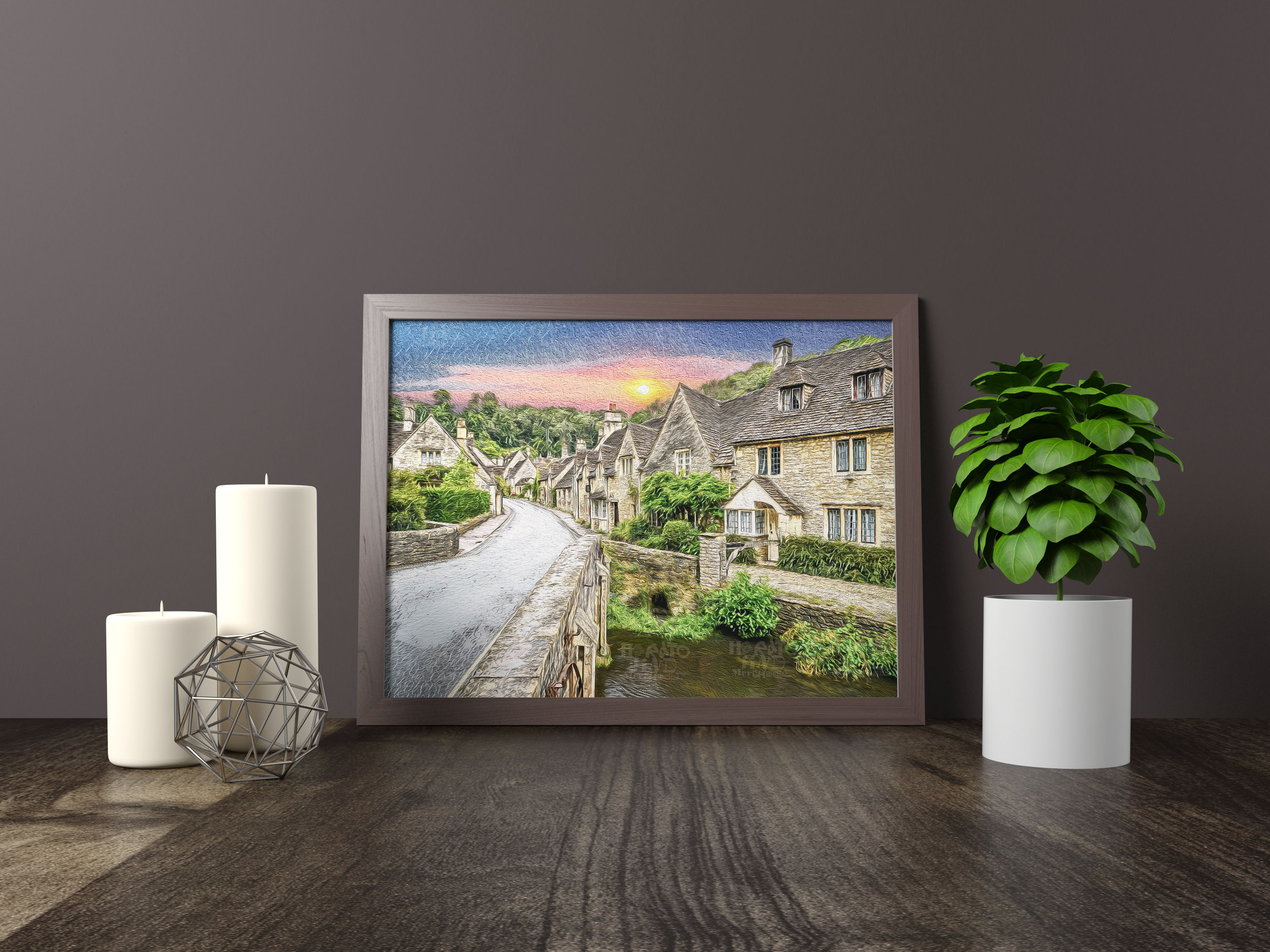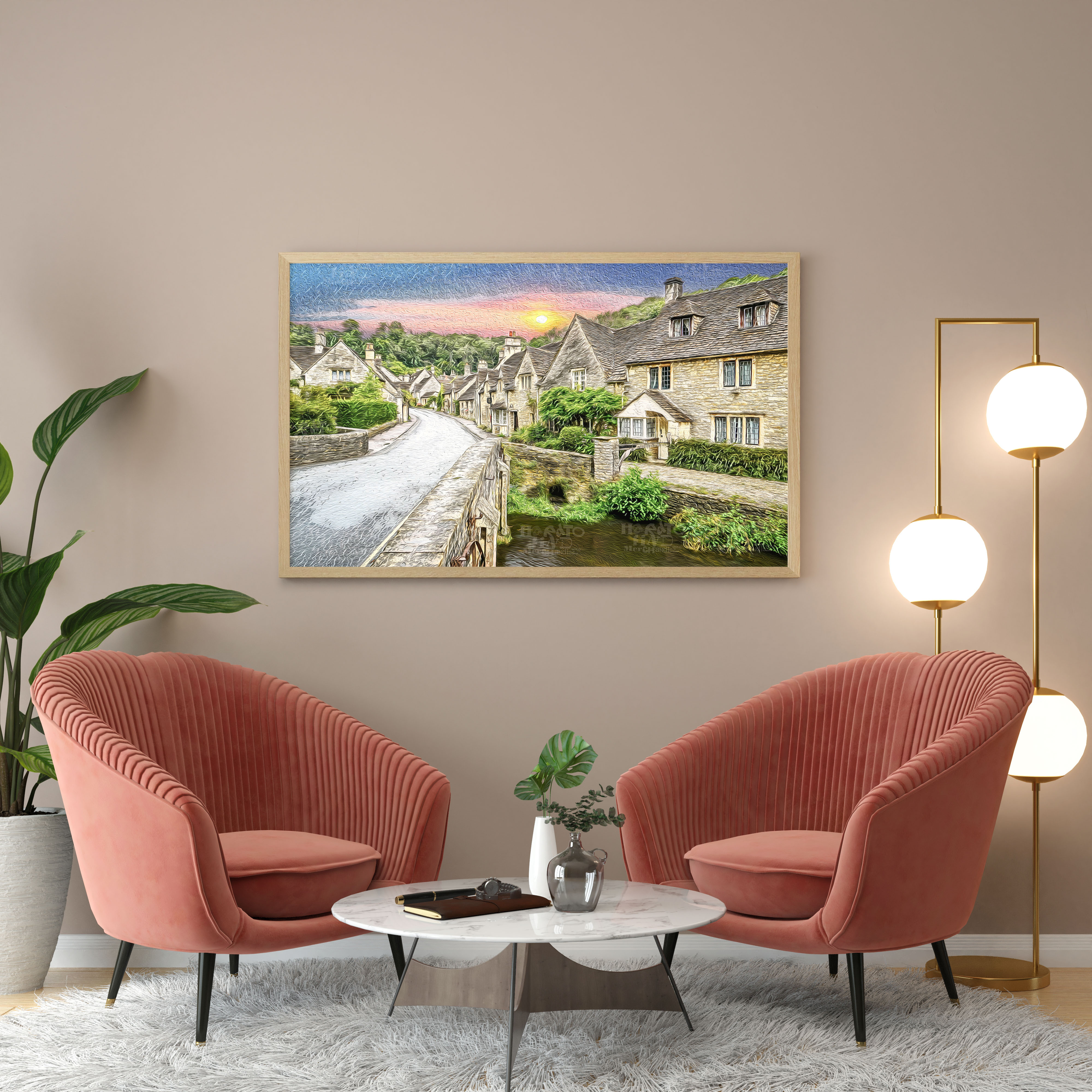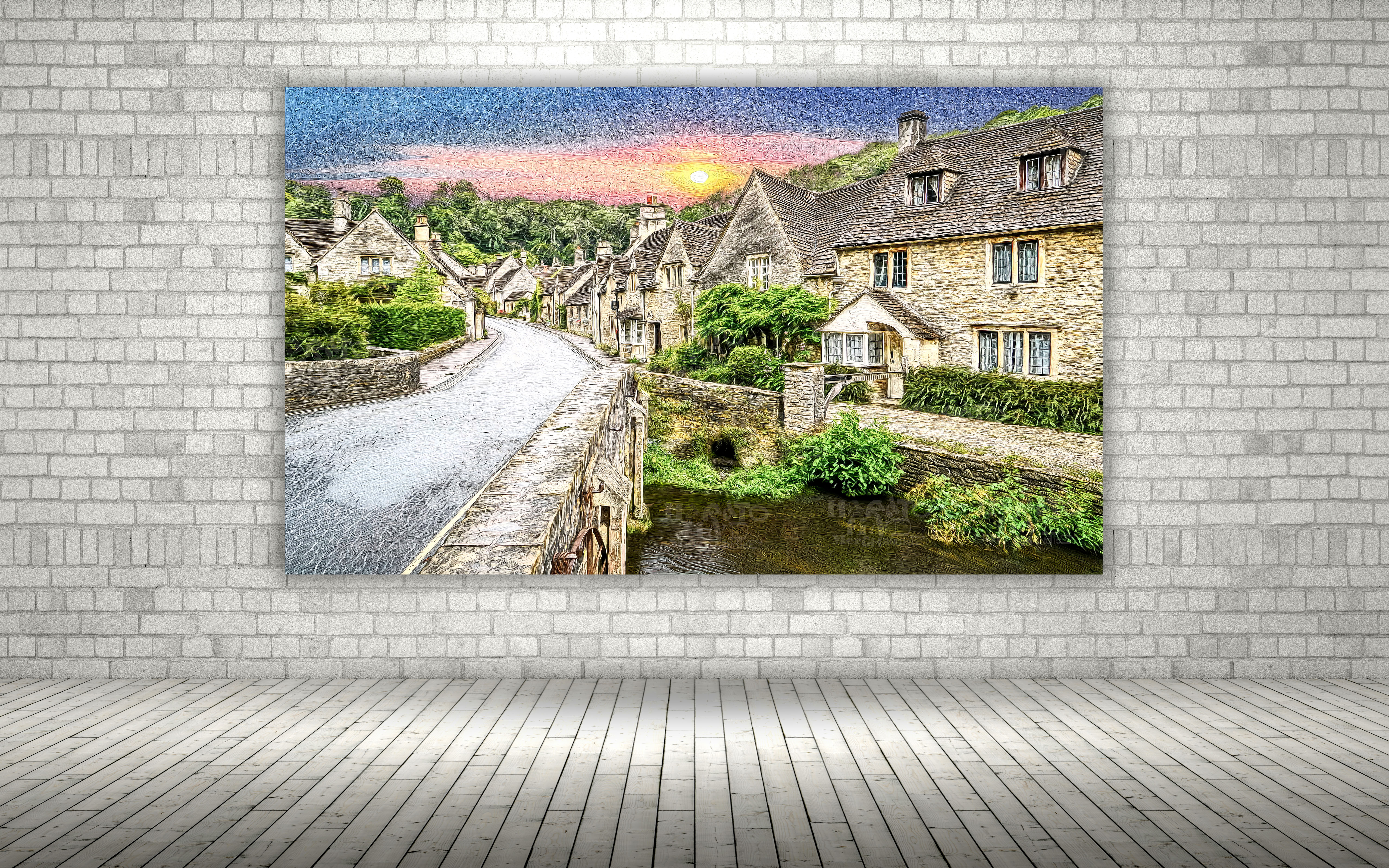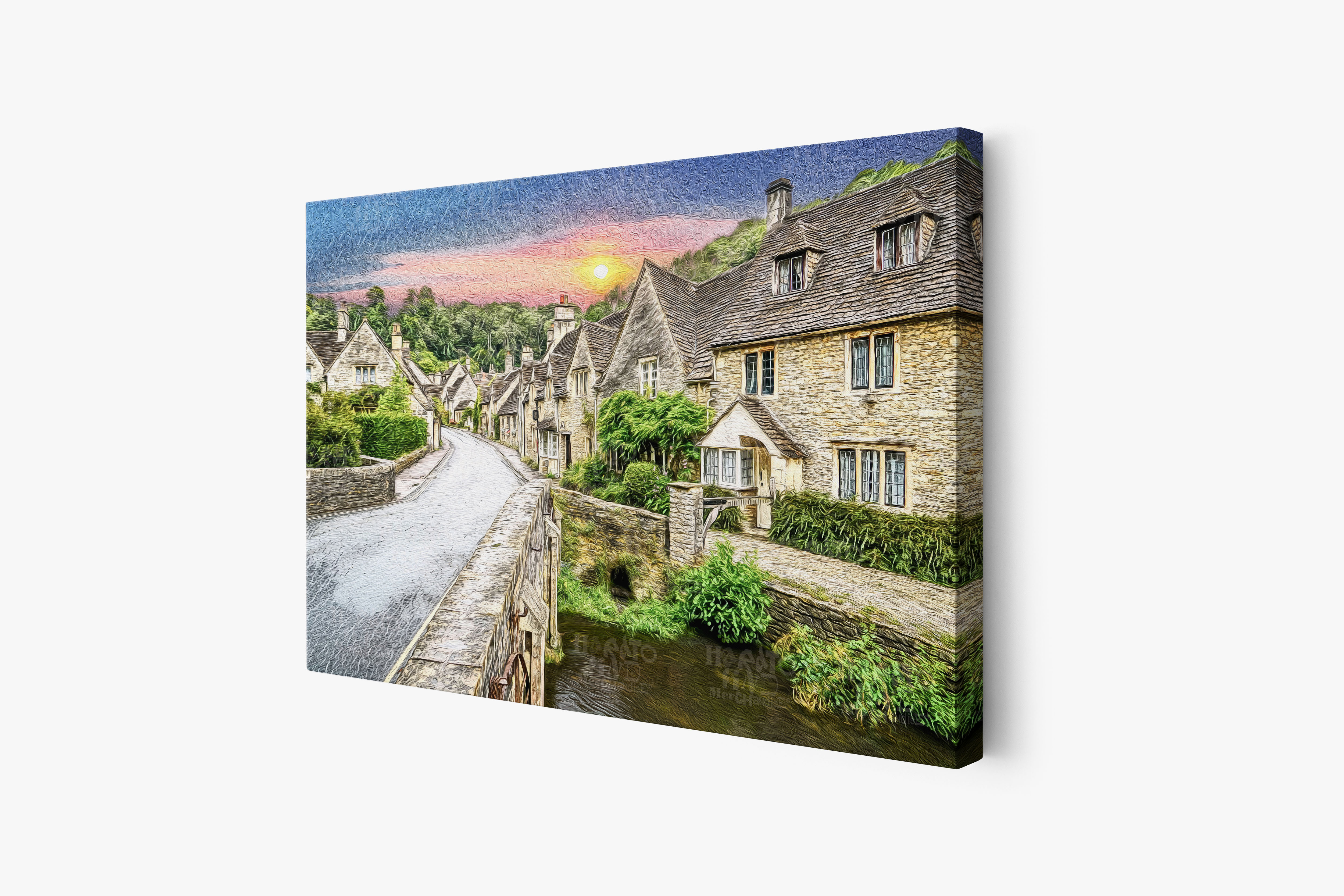 A warm sunset oil-style artwork of Castle Combe village, Wiltshire. Golden evening light, stone cottages and a winding stream create a peaceful, romantic countryside scene inspired by traditional oil painting techniques.