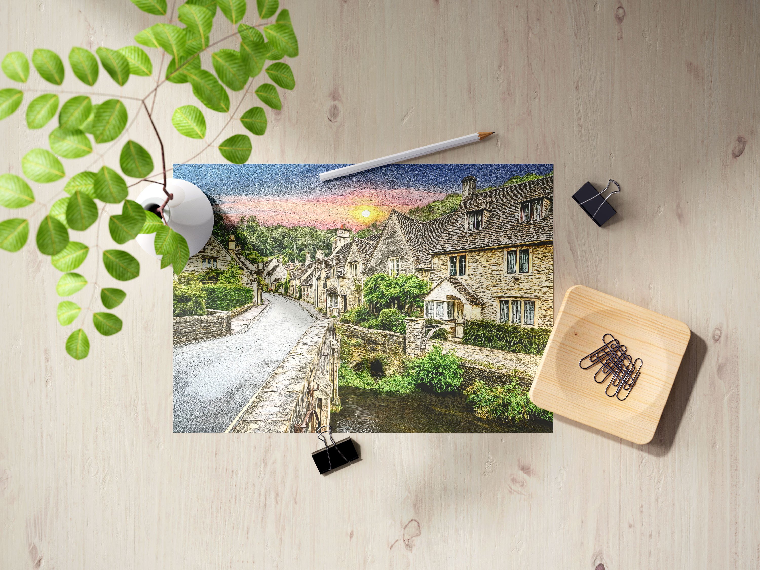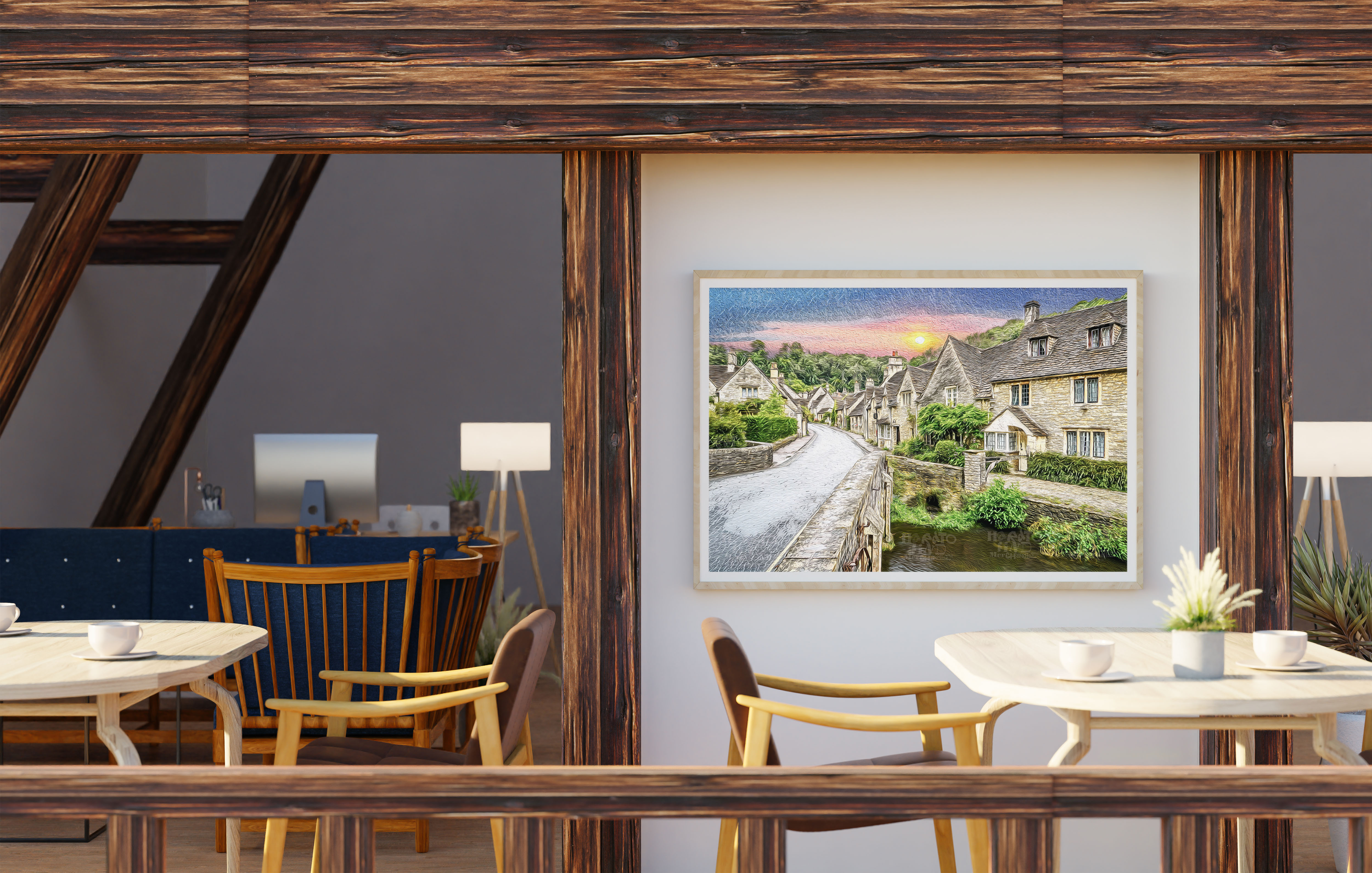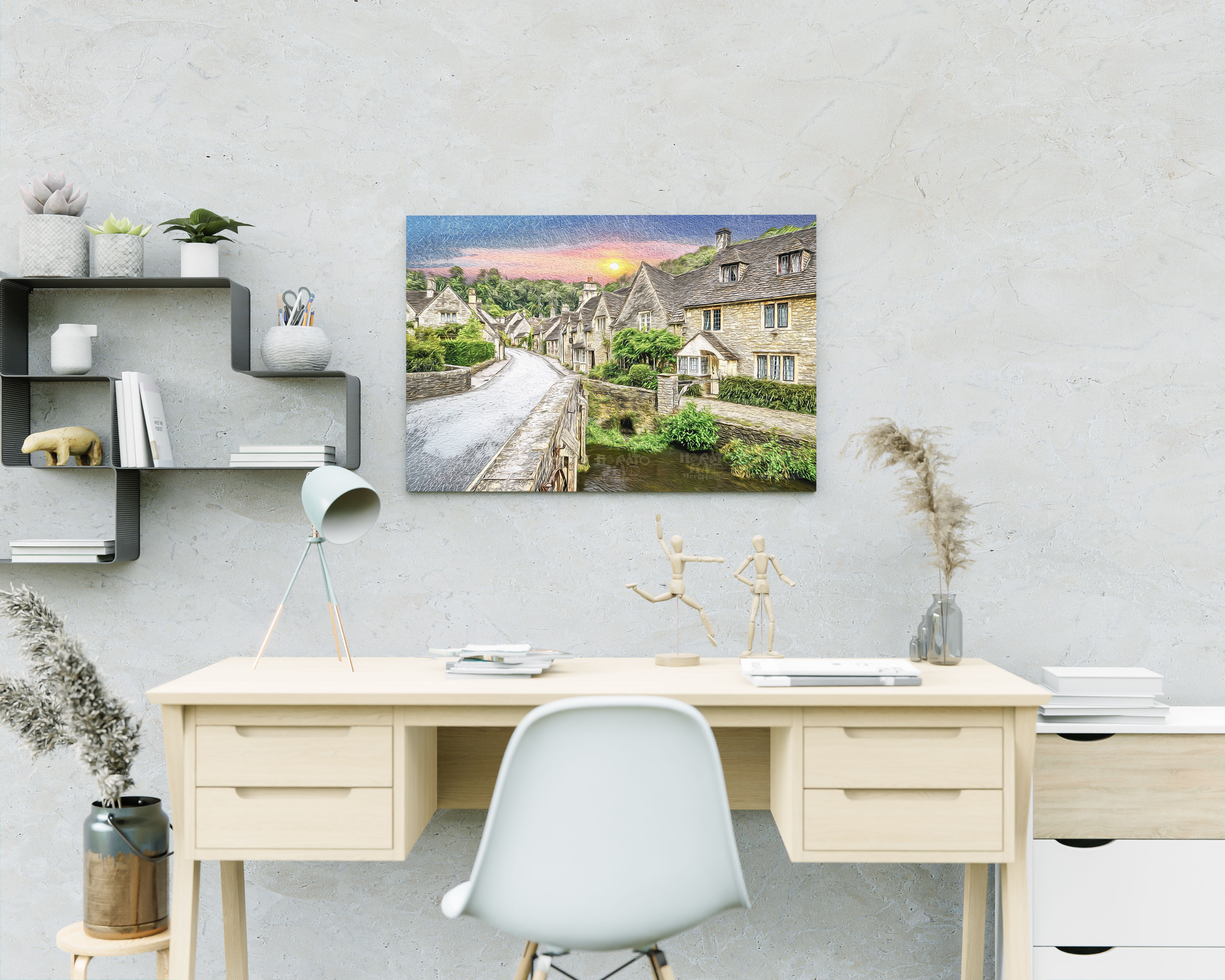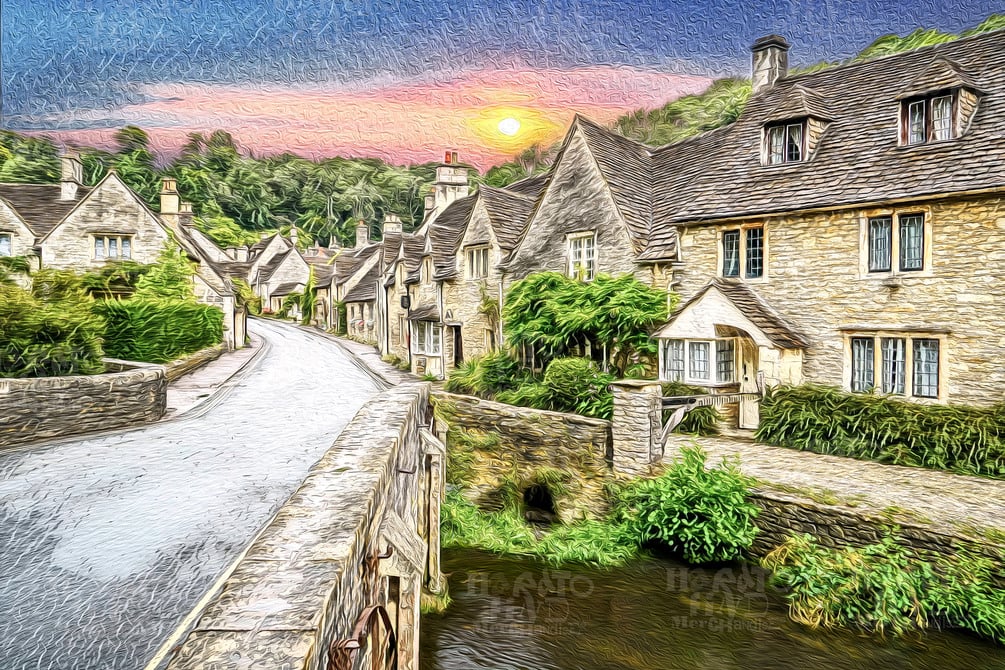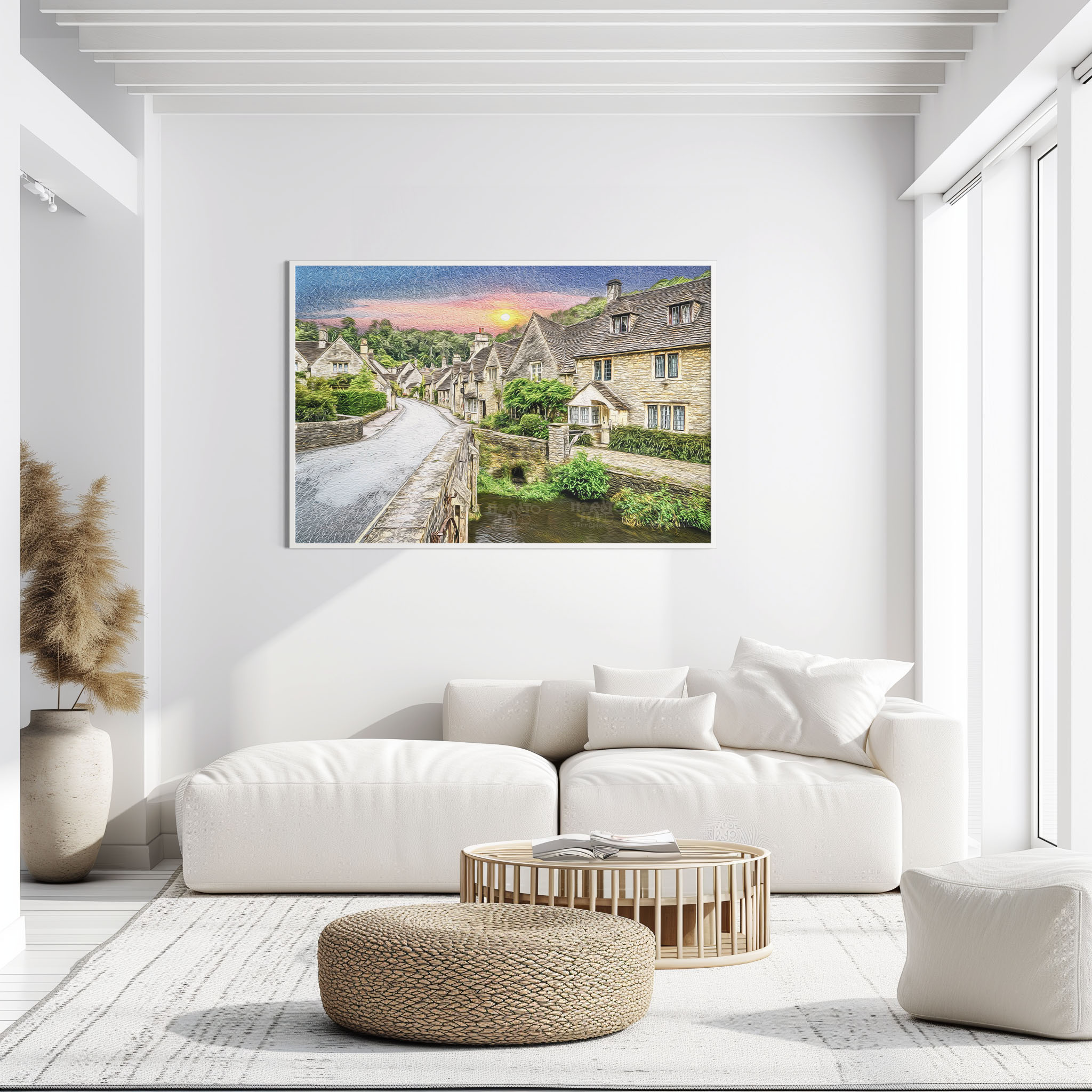 A warm sunset oil-style artwork of Castle Combe village, Wiltshire. Golden evening light, stone cottages and a winding stream create a peaceful, romantic countryside scene inspired by traditional oil painting techniques.