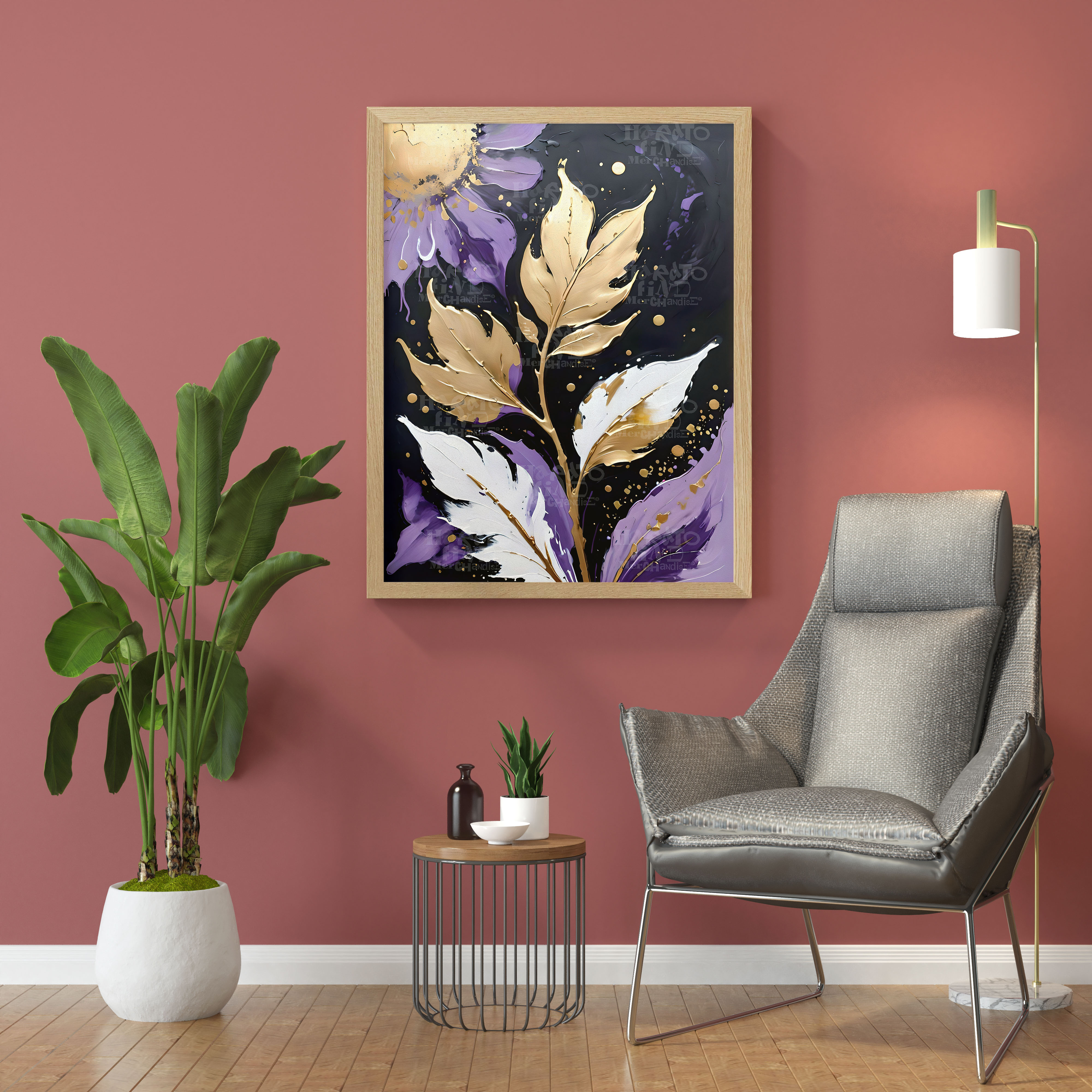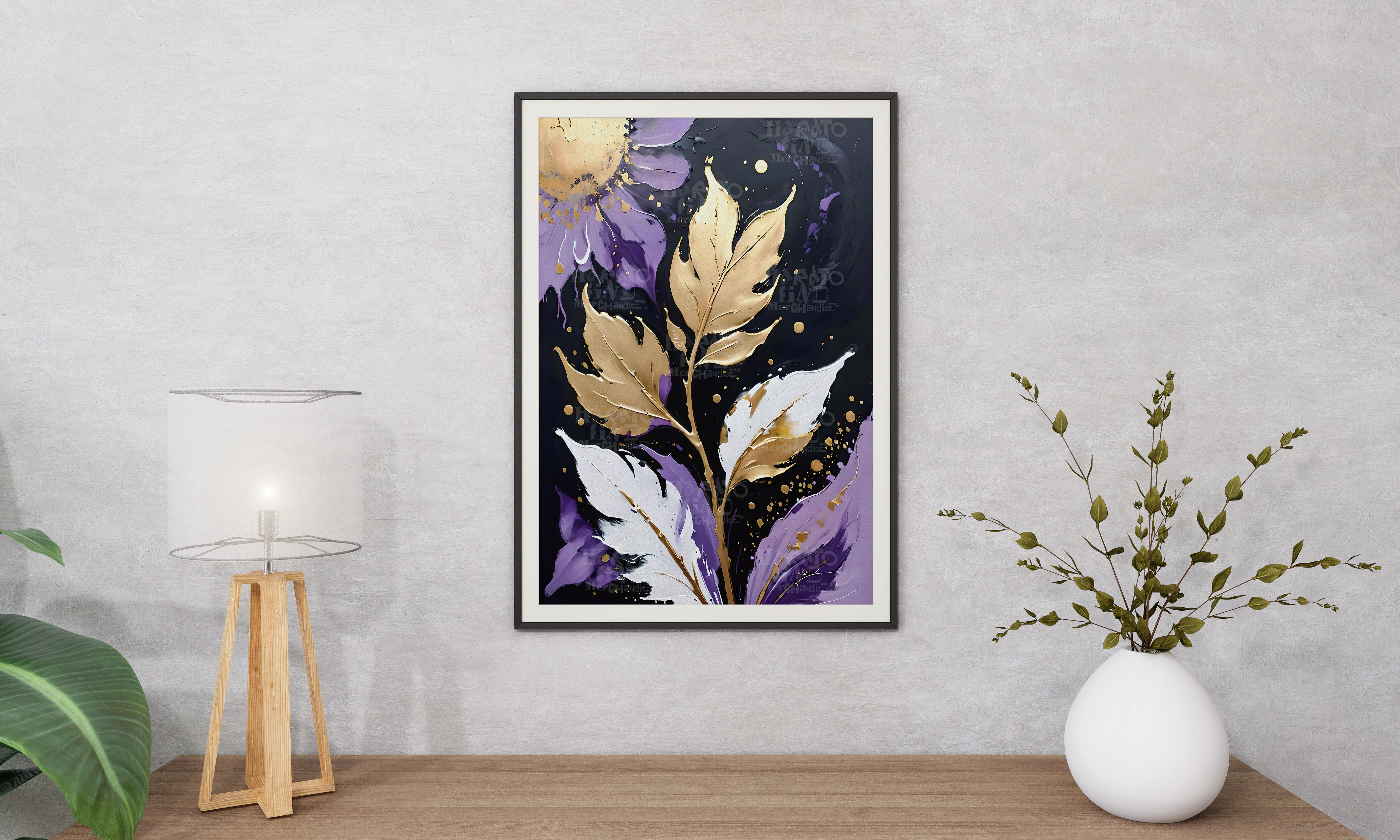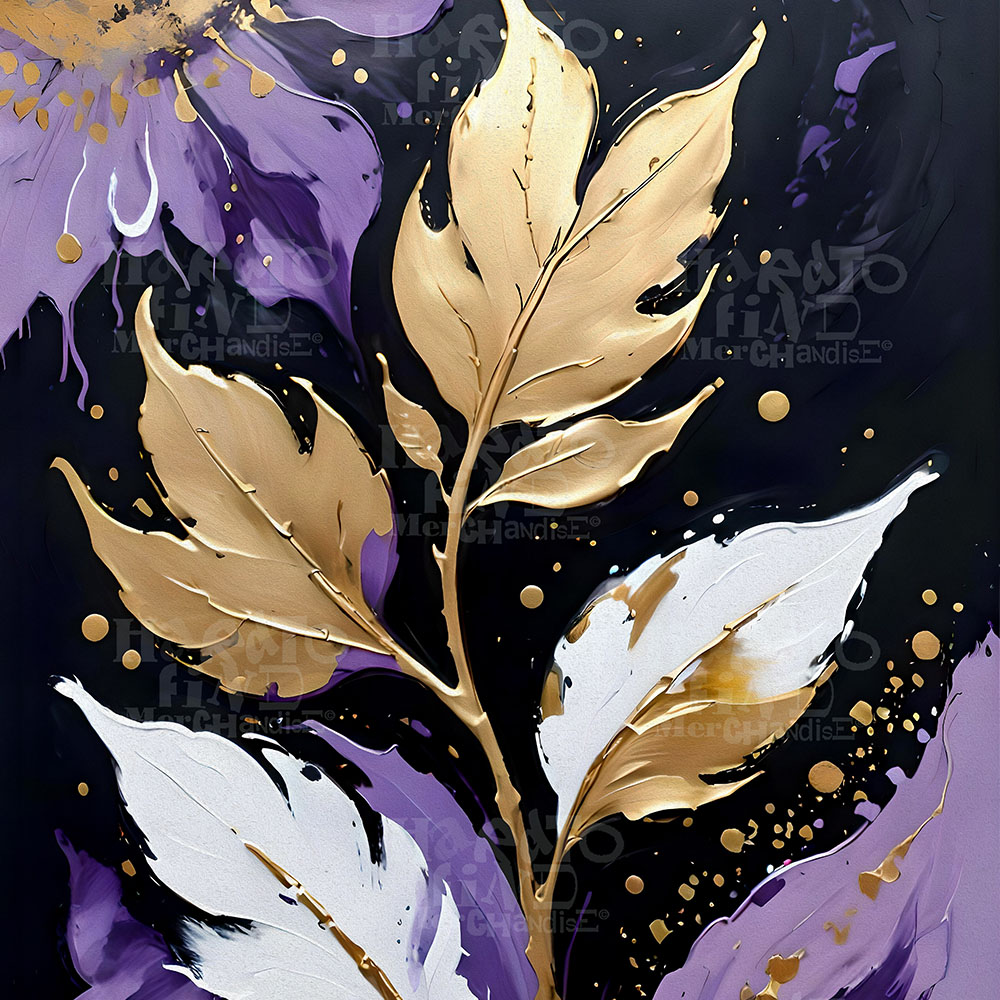 🌿 Add a touch of elegance to your space with this digital botanical artwork in rich purple, gold, and white textured tones.